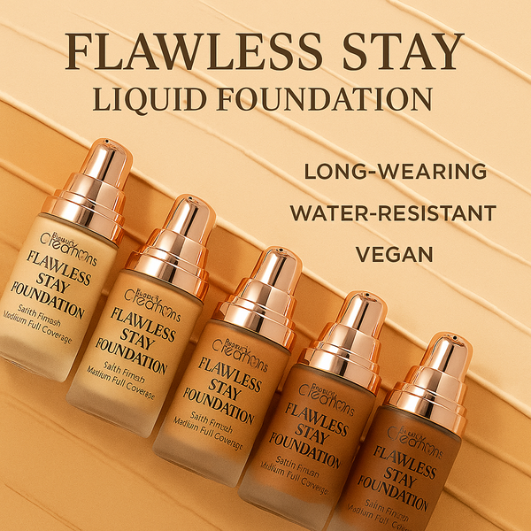 Achieve a flawless, natural-looking complexion with our Flawless Stay Foundation, expertly formulated to blur imperfections and create a comfortable, breathable wear. With soft blurring pigments, this foundation provides medium to full coverage while maintaining a satin finish that works beautifully for all skin types from oily to dry. Available in a wide range of 26 shades, this foundation is designed to seamlessly blend with your skin tone for a perfect match. The oil-free, hydrating formula ensures long-lasting wear without feeling heavy, while the lightweight texture keeps your skin feeling fresh throughout the day. Infused with Vitamin E, it nourishes and protects your skin, leaving it soft and smooth. Key Features: Satin Finish – Natural, radiant look with a soft matte undertone Oil-Free – Perfect for all skin types, especially oily skin Hydrating – Keeps skin moisturized for a smooth, fresh look Long-Wear – Stays in place all day without touch-ups Lightweight Formula – Comfortable wear without feeling heavy Infused with Vitamin E – Nourishes and protects your skin