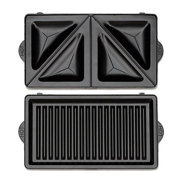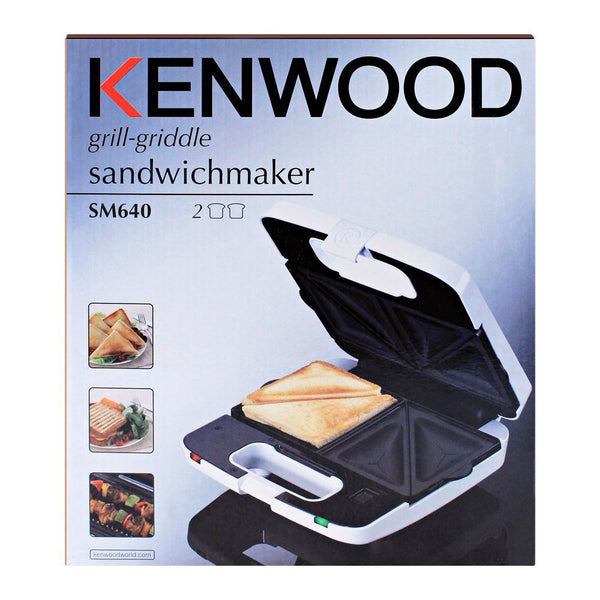 Kenwood SM640 sandwich maker with interchangeable plates for grilling and toasting. Non-stick plates, safety latch, 700W power.